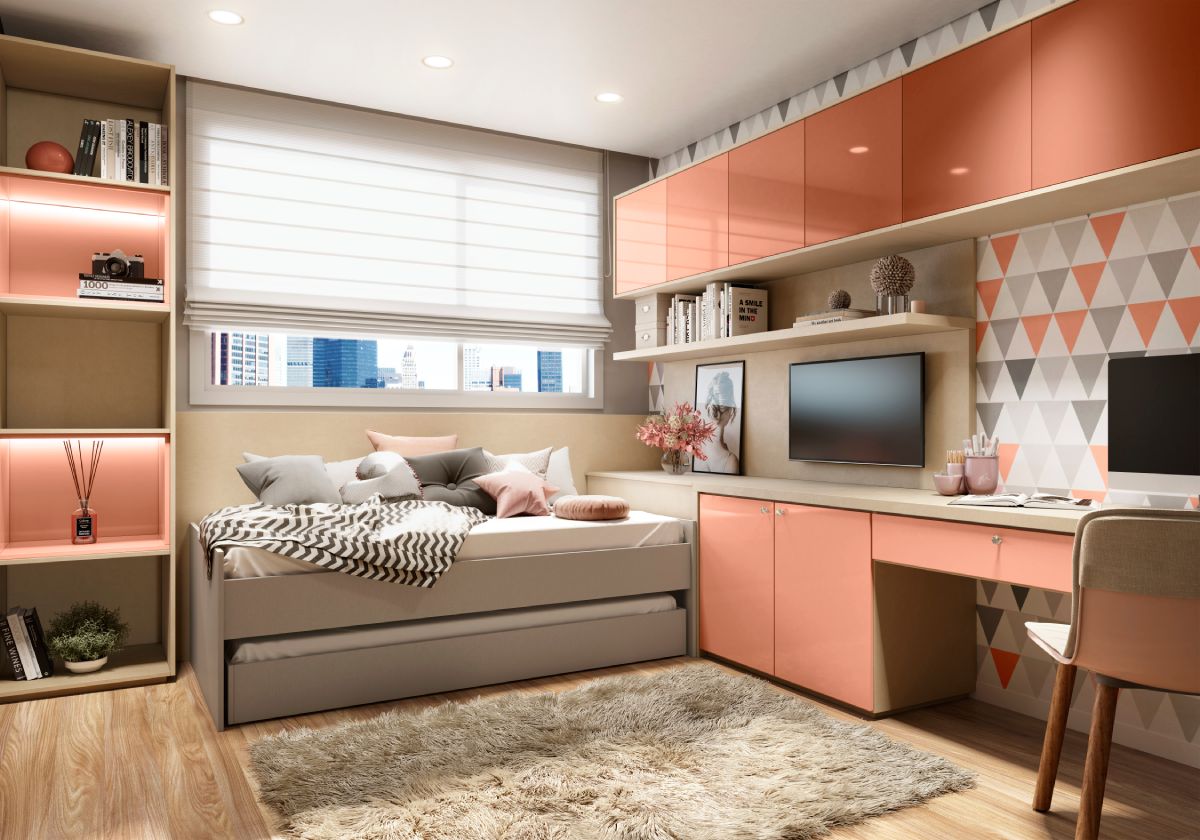 A cor laranja inspira otimismo e criatividade. Em excesso e/ou quando há alta saturação, o ambiente pode ficar cansativo e exagerado.