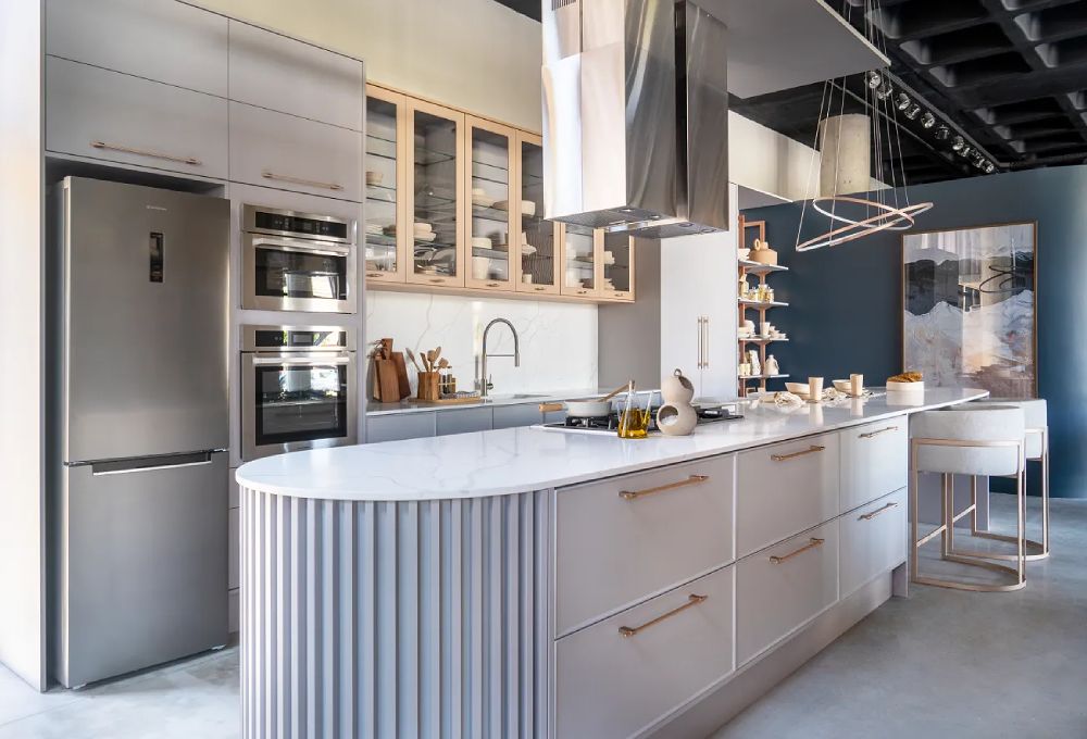 É comum distribuir os elementos da cozinha de maneira tradicional, como de costume. Contudo, se a ideia é inovar, é possível repensar essa disposição para criar um layout não linear e transformador. A incorporação de ilhas multifuncionais, bancadas não convencionais e espaços de armazenamento criativos otimiza o fluxo de trabalho e maximiza o aproveitamento do espaço.