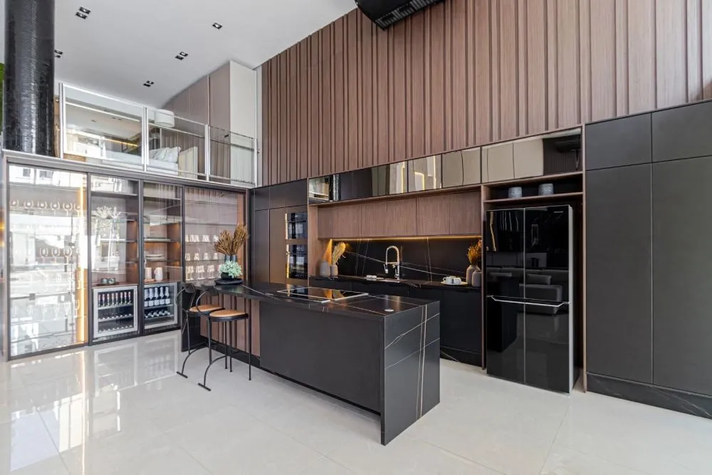 A tendência de integrar eletrodomésticos, como cooktops e fornos, às bancadas e ilhas otimiza o espaço e cria um visual clean. Esta abordagem é ideal para cozinhas compactas, onde cada centímetro conta. Além disso, facilita a criação de áreas de trabalho eficientes e ergonômicas.