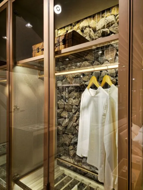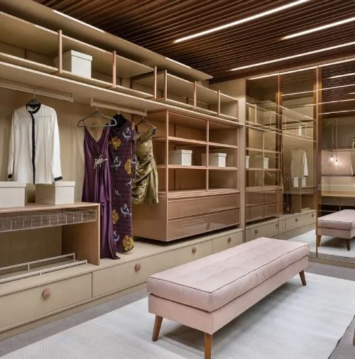 Closet aberto, criando a sensação de amplitude e sofisticação.