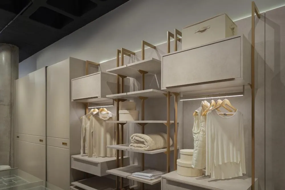 A harmonia de cores e materiais em um Closet aberto, com design elegante.