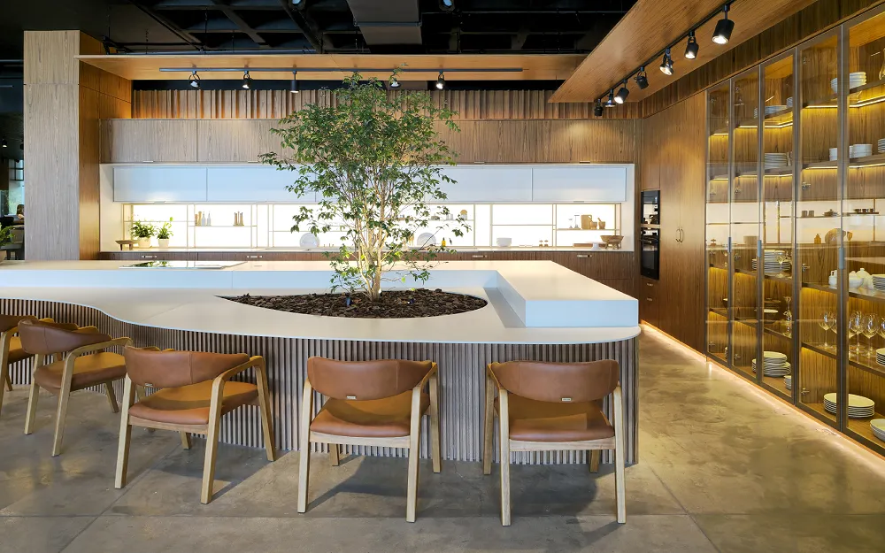 O impacto dos materiais e estilos escolhidos é evidente no espaço destacado pela foto do Showroom Criare. A madeira nas paredes traz uma textura quente que complementa os tons neutros e suaves do mobiliário. A inserção sutil de cores, como o verde das poltronas ao fundo, adiciona vida e personalidade sem sobrecarregar o ambiente.