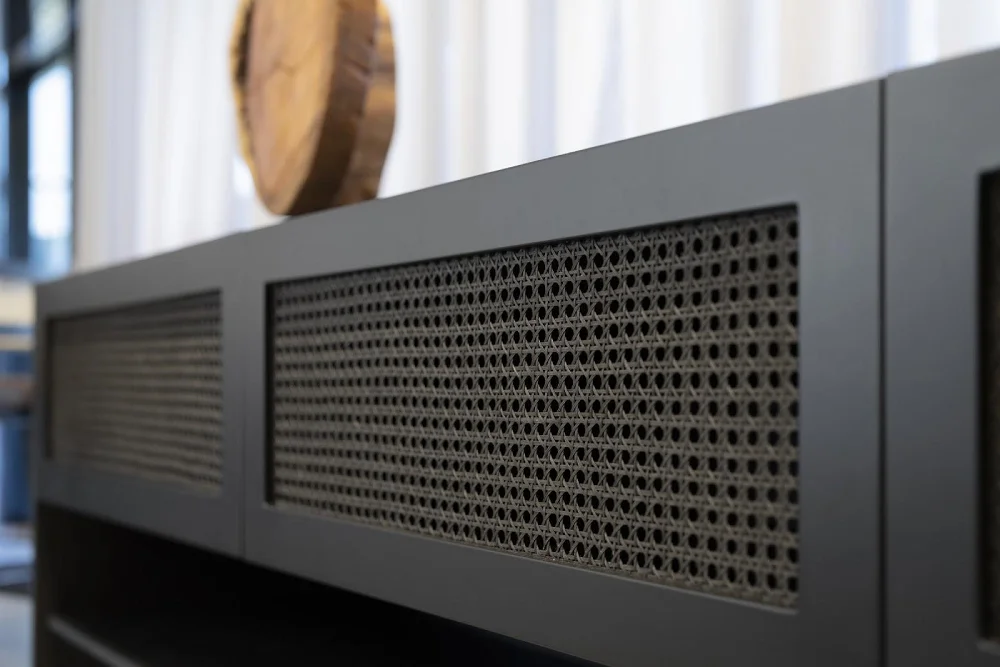 Este material, típico de décadas passadas, é caracterizado por seu tecido trançado natural. Utilizado em cadeiras, poltronas e cabeceiras, a palhinha indiana confere um charme vintage e uma textura única aos móveis.