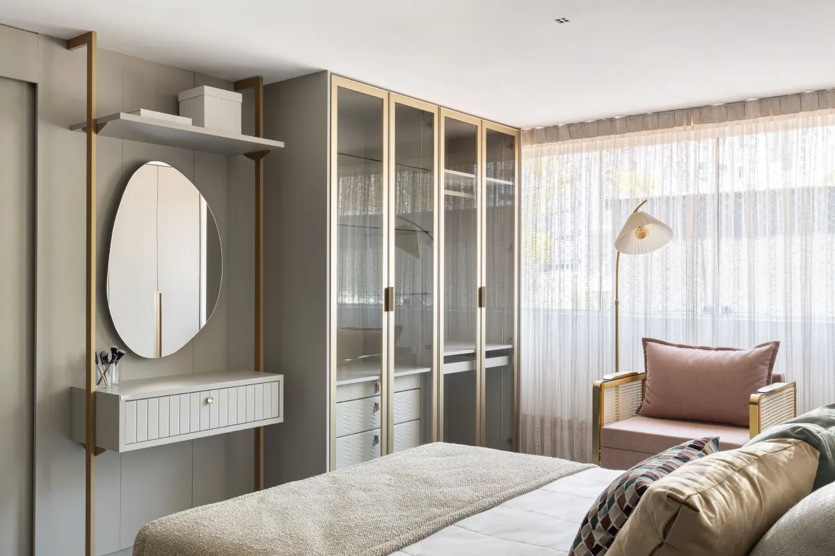 · Banheiro integrado: a integração entre banheiro e closet cria uma transição contínua e sofisticada, além de maximizar espaço. Um design bem elaborado permite a inclusão de armários para toalhas e produtos de higiene, espelhos estrategicamente iluminados e até uma área de penteadeira, preservando a elegância da sua suíte planejada.