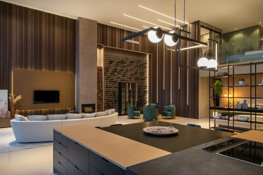 Num living, sofás e poltronas devem ser dispostos em um formato circular ou semicircular para facilitar a conversa e a interação.