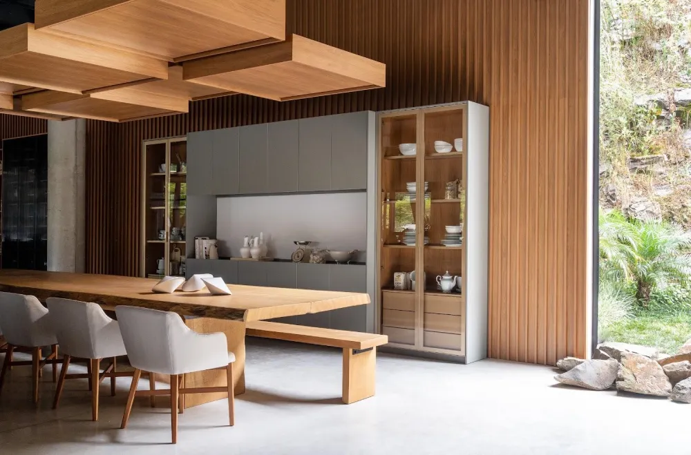 A sala de jantar geralmente vai ao encontro da área de estar e também se beneficia enormemente dos móveis planejados. Mesas que se ajustam ao tamanho do ambiente e cadeiras que complementam seu design, criando um conjunto harmonioso são um bom exemplo disso. Armários ou buffets planejados especificamente para este espaço são esteticamente agradáveis, além de práticos, oferecendo soluções inteligentes de armazenamento para utensílios e louças, ao mesmo tempo que facilitam a circulação no ambiente.