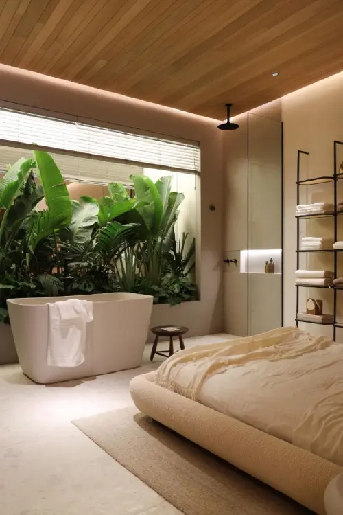 • Natureza: materiais naturais, como madeira e pedra, estão em alta. Plantas e elementos naturais trazem frescor e vida ao espaço.